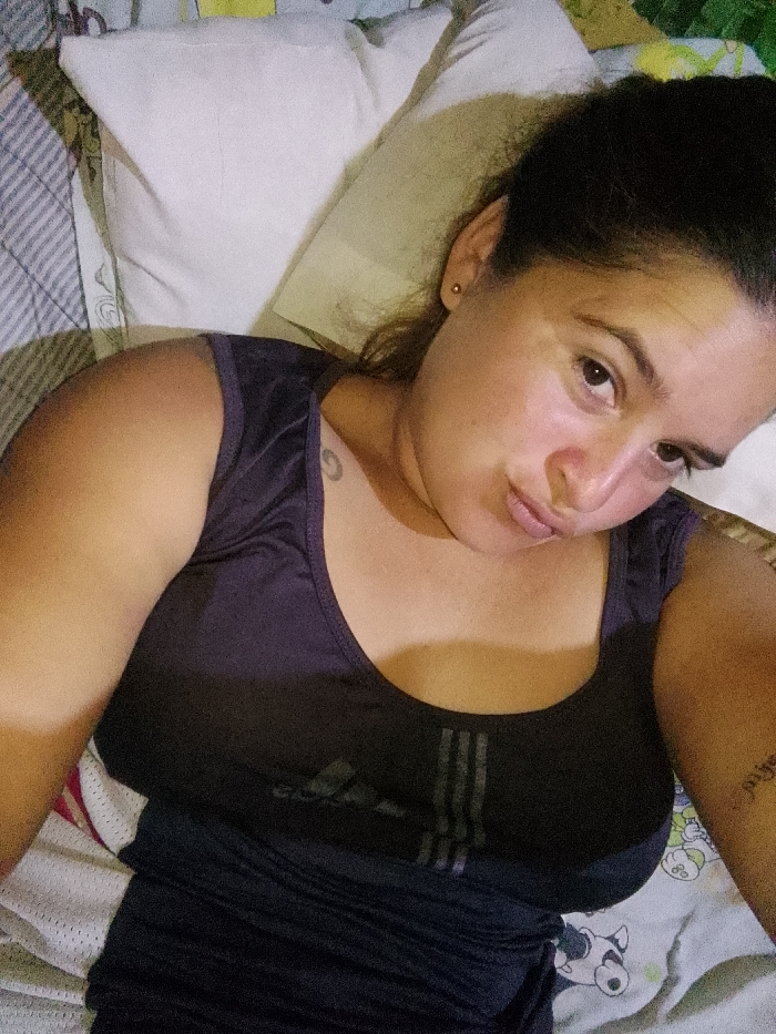 An adult female subject is depicted reclining in an indoor setting, likely a bedroom, from an overhead perspective. Her dark hair is pulled back, revealing a small, gold-colored stud earring in her right earlobe. She possesses a medium complexion, dark eyes, and looks directly at the camera with slightly pursed lips. She is wearing a dark purple, short-sleeved, scoop-neck top. Beneath this top, a dark-colored garment with three prominent vertical stripes is visible. A stylized "G" tattoo is located on her upper left chest/shoulder area, and partially obscured script lettering is visible on her left forearm. She is resting on a white pillow, with visible bedding consisting of a light blue and white striped sheet, and another light-colored sheet featuring cartoon animal patterns, including a black and white cow's face. The specific location in the city of Altagracia, Venezuela, cannot be determined from the visual evidence within the image.
