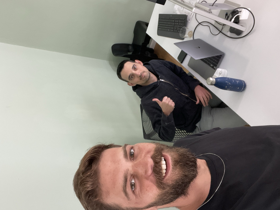 Two men are in an office in Tel Aviv-Yafo, Israel. The man in the foreground is wearing a black shirt and a silver chain necklace, and is smiling at the camera. The man in the background is wearing a black jacket over a grey shirt and is sitting at a white desk. He is giving a thumbs up. The desk has a laptop, a cell phone, a water bottle, a glass, a computer monitor, a keyboard, and a mouse. The walls are painted a pale green. There is a black chair to the right of the men. The walls are covered in a pale green paint. The office is well-lit and appears to be a typical modern office. The office is located at latitude: 32.065, longitude: 34.774.