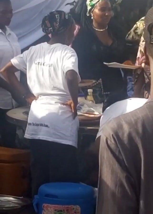 A group of people stand around a table covered with food items. Most individuals are wearing white T-shirts with writing on the back. One person, wearing a headscarf, holds a plate of food and appears to be serving themselves. A blue cooler and a green crate of bottled beverages are on the ground near the table. The environment appears to be outdoors, with a white tent or canopy providing shade.