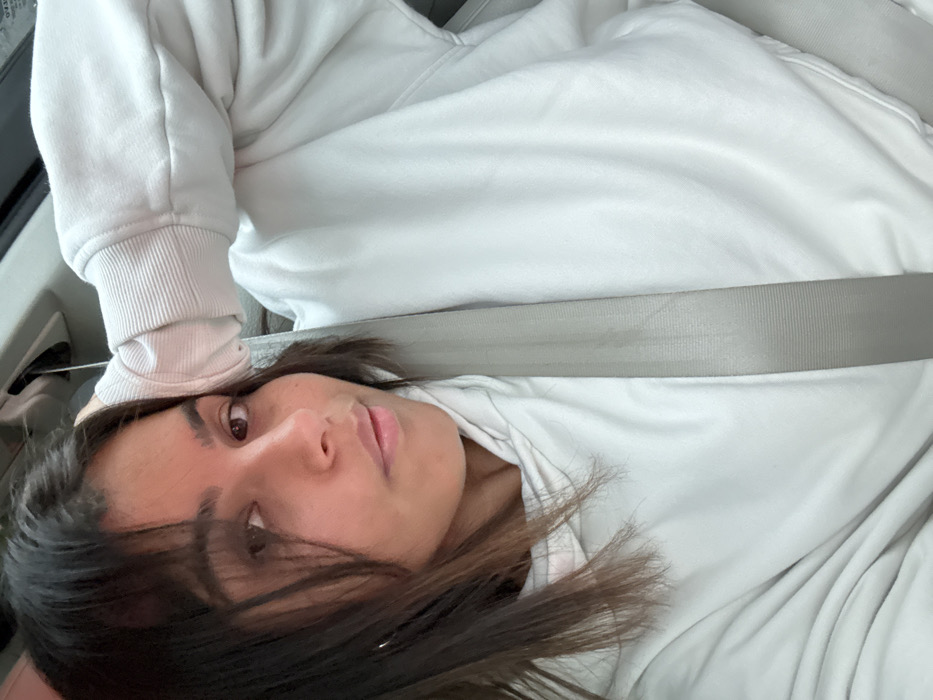 A young adult female is depicted in a close-up, head-and-shoulder shot, seated inside a vehicle. She has medium-brown skin, dark brown shoulder-length hair, and dark brown eyes, looking directly at the camera with a neutral expression and slightly parted lips. She wears a light-colored (likely off-white or very light grey) hooded sweatshirt, with the ribbed cuff of her left sleeve visible near her head. Her left hand is raised, with fingers resting near her temple and hairline. A light grey seatbelt diagonally crosses her chest from the upper right to the lower left, indicating she is secured within the vehicle. The background consists solely of the indistinct light-colored interior elements of the vehicle. No external environment or specific vehicle identifying details are discernible. Based solely on the image, there are no visual indicators to determine a specific location within Princeton, United States, or any other city.