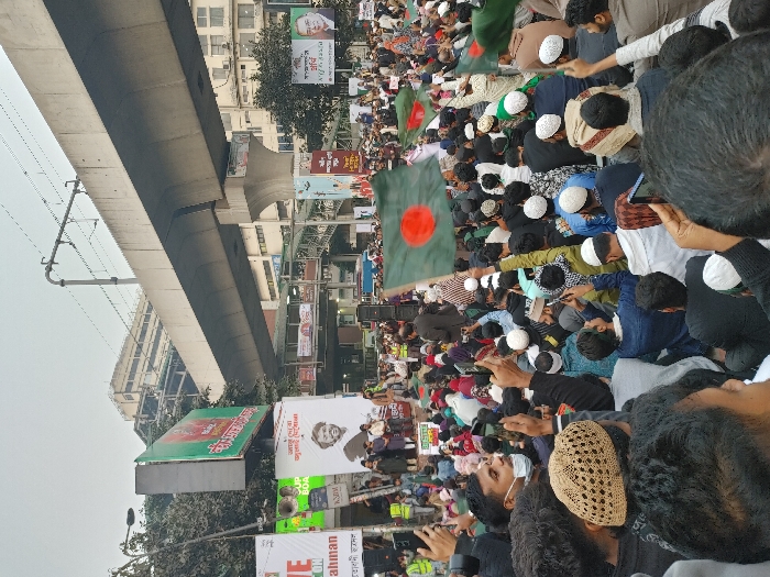 - "A large outdoor public gathering is depicted in an urban environment in Dhaka, Bangladesh, likely in the vicinity of the National Press Club or Shahbagh, given the prominent elevated metro rail structure and pedestrian overpass" by FM-PRZ6s1, licensed under CC BY 4.0