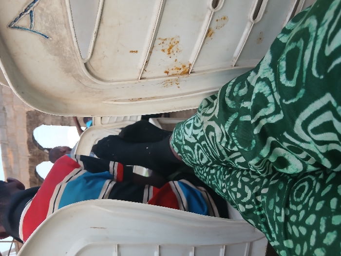 A stack of white plastic chairs occupies the frame. A person wearing a green and white patterned garment sits in one chair. Below them, another person is seated, clad in black socks, a blue and red striped shirt. The chairs above appear worn, with some staining. In the background, hints of a window or architectural detail are visible. The composition is taken from a low angle, focusing on the arrangement of chairs and people.