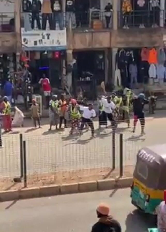 From an elevated position, a video shows a street scene with a two-story commercial building lining one side. A group of approximately 15 people are dancing in the street, some wearing bright vests. Other people are watching from the street and from the second story balconies of the building. Two auto rickshaws and a car are parked or passing by. The weather appears sunny. The overall impression is of a vibrant and lively street scene, likely a celebration or performance.
