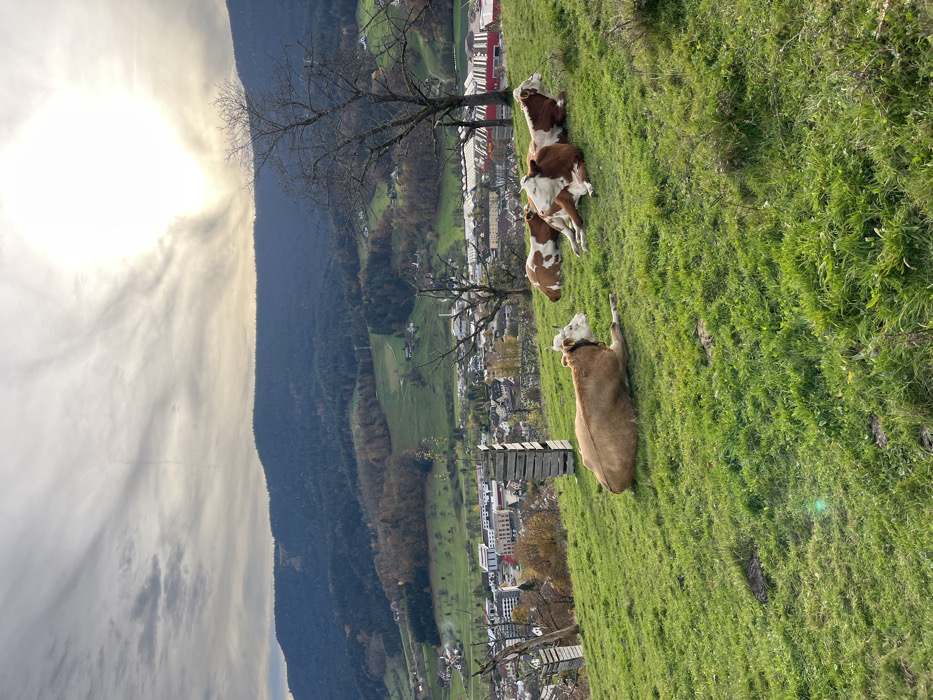 The image displays an elevated view overlooking the town of Oppenau, Germany, situated in a valley surrounded by forested mountains under a partly cloudy sky. In the immediate foreground, a verdant grassy slope extends from the bottom of the frame upwards. Four cows are visible, lying prone on this slope. One light brown cow, possessing small horns and wearing a bell around its neck, is positioned in the lower-left, facing to the right. To its right and slightly further back, three additional cows, characterized by brown and white patching, are also lying down in a cluster. To the left of the foreground cow, two vertically stacked wooden structures, resembling crates or beehives, are present. Two prominent leafless deciduous trees stand on the right side of the mid-ground, behind the cluster of cows. The mid-ground reveals the town of Oppenau, consisting of numerous buildings of varying sizes and architectural styles, including several with red roofs, indicative of industrial or larger structures. Roads and faint outlines of vehicles are discernible within the urban area. Surrounding the town and ascending the lower mountain slopes are cultivated green fields and patches of deciduous and coniferous trees, some exhibiting autumn colors. The background is dominated by densely forested mountains, primarily covered in dark green coniferous trees, extending across the upper horizon. The sky, occupying the upper portion of the frame, features scattered cirrus and stratocumulus clouds. A bright, diffused sun, partially obscured by clouds, is visible in the upper-right quadrant, casting light upon the scene.