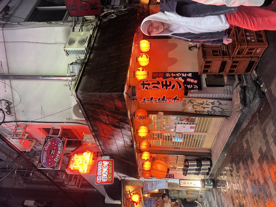 The image depicts a nighttime urban street scene in Osaka, Japan, characterized by artificial lighting and wet, reflective pavement. The central subject is a two-story commercial building, illuminated primarily by red and orange neon signs and lanterns. On the building's ground floor, an establishment with a roll-down shutter entrance is prominently decorated with a string of small orange lanterns and a large vertical red lantern displaying the Japanese characters for "ホルモン" (Horumon). A red sign also advertises "かすうどん" (Kasu Udon) and "串牛ホルモン" (Kushi Gyu Horumon). Adjacent to this, to the left, is an open-front bar area where two indistinct figures are seated, one seen from behind in a dark jacket. Above the ground floor, multiple illuminated signs are visible, including a prominent red neon sign reading "SHOT BAR R.B." and a rectangular sign stating "magic shop" with Japanese text "ひげめがね" (Higemegane). The building's upper facade is a lighter, weathered color, with several external air conditioning units and exposed wiring. In the foreground, slightly right of center, a male subject is captured mid-stride, partially cropped. He wears a light-colored hooded sweatshirt, a dark jacket, red pants, and a light-colored baseball cap, and is looking towards the left side of the frame. The pavement in front of the building is wet and exhibits a cobblestone pattern, reflecting the red and orange light. To the left of the main entrance, a stack of four silver metal kegs or containers rests on the pavement. To the right of the entrance, a stack of three brown wooden crates is positioned. A small, dark stone formation is also visible at the base of the building.