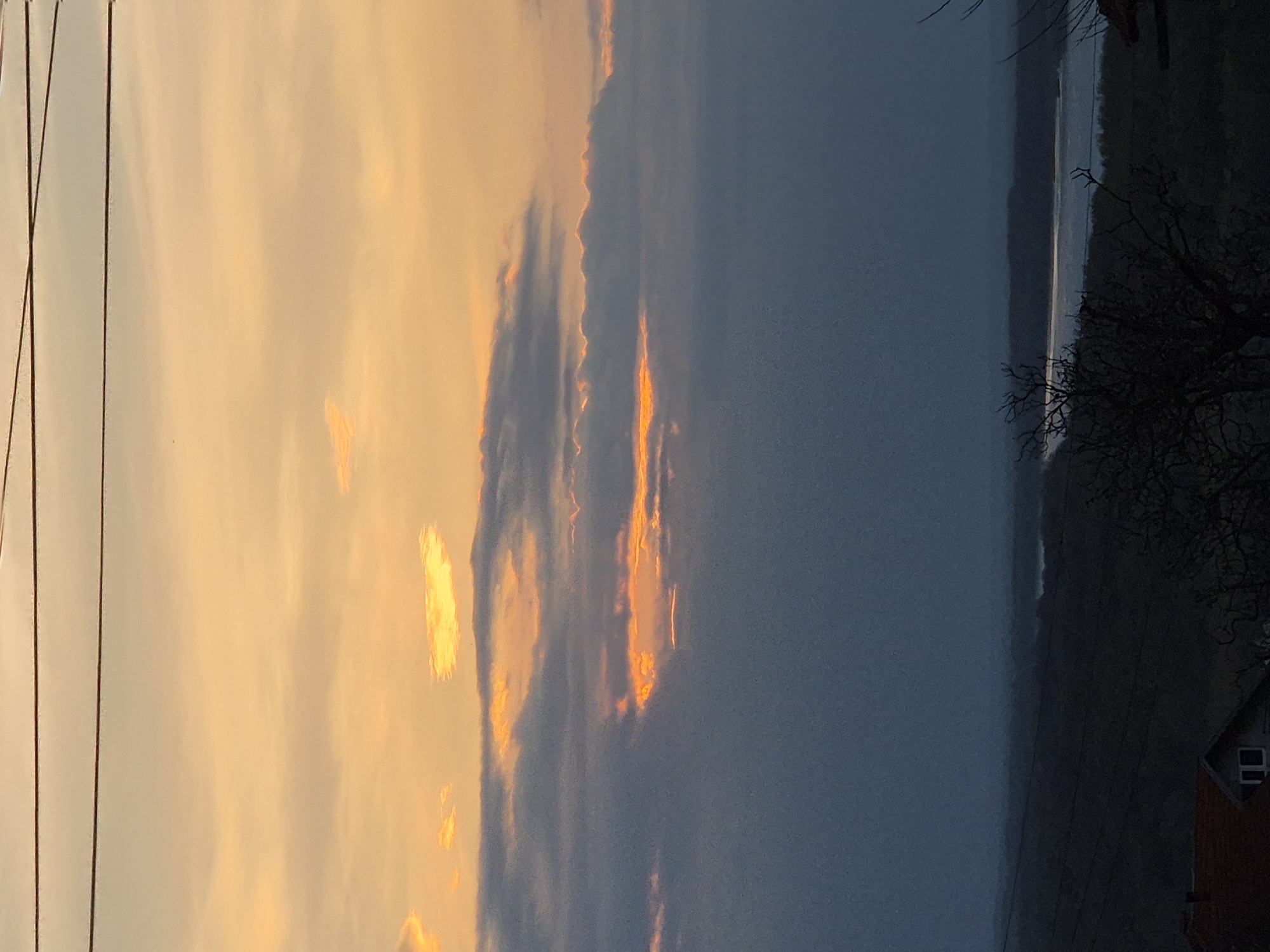 sunset over a landscape, with power lines visible in the sky on the left