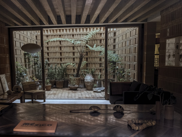 The image depicts an interior view of a contemporary space, looking out into an enclosed courtyard, located in Puebla, Mexico