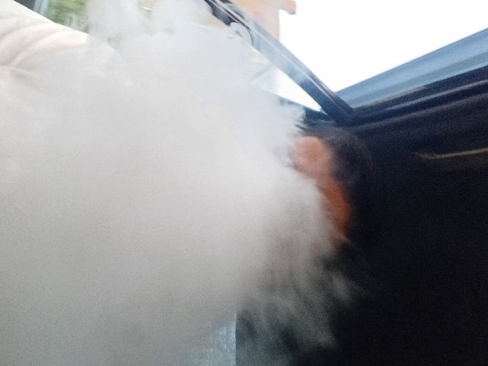 A passenger vehicle interior, located in Al-Mazza Municipality, Syria. The foreground and center are dominated by a dense, white to light-gray cloud of vapor, obscuring much of the scene. Behind and partially visible above the vapor, the upper portion of a person's head, showing light-toned skin, is discernible. A dark mass, possibly hair or the vehicle's dark interior, is above the head. A white garment is visible in the lower-left, beneath the vapor cloud. To the left, a vehicle window frame is present, through which an exterior view shows a bright, overcast sky. Faint, indistinct brown architectural structures and green foliage are visible through the window in the distance. The overall composition suggests the act of vaping or exhalation of vapor within the vehicle.