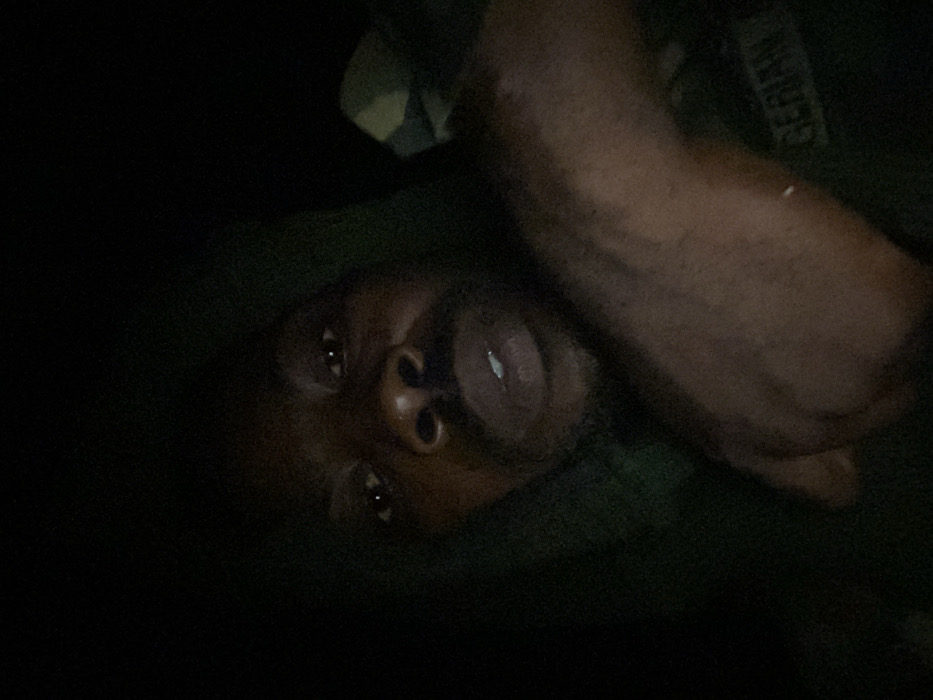 A close-up, low-light image depicts an adult male with dark skin and a beard, looking directly at the camera