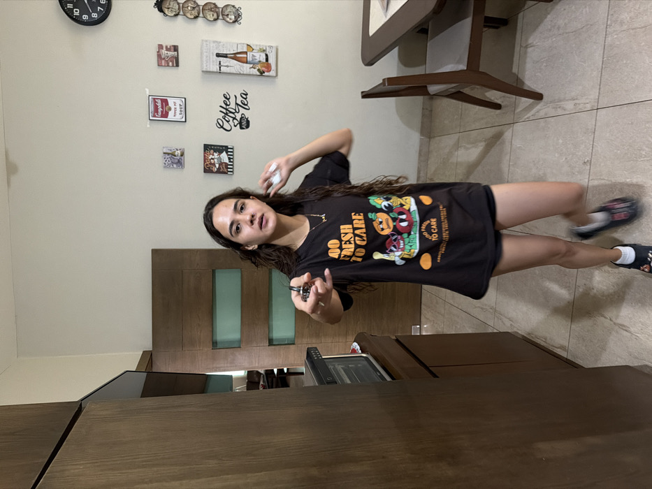 A woman stands indoors, facing the camera. She holds small scissors with a prominent ring on her left hand. Her hair is long and wavy. She wears a black T-shirt with a cartoon graphic. She wears black and white patterned shoes. Behind her are a clock, decorative wall hangings, a table with chairs, a door, and dark wooden cabinets. The floor is tiled in light gray.