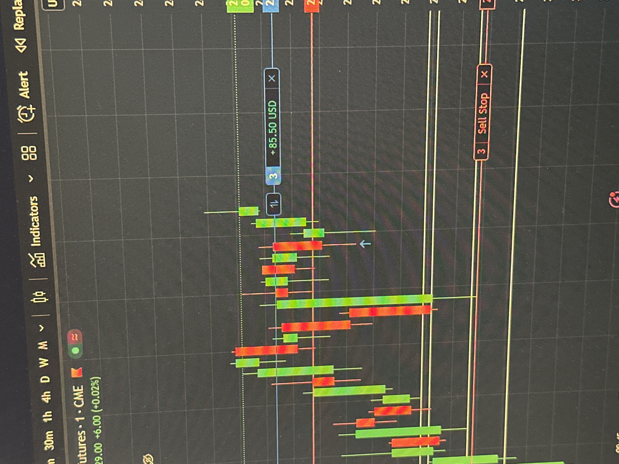 The image displays a digital financial trading interface on a screen, presumed to be located in Sofia, Bulgaria. The primary subject is a candlestick chart rendered on a dark gray background with a lighter gray grid. **Subjects and Objects:** * **Digital Display:** A screen showing a financial trading platform. * **Candlestick Chart:** Dominated by numerous red and green candlesticks, representing price movements over time. Green candles indicate upward price movement, while red candles indicate downward movement. Most candles feature vertical wicks extending from their bodies. * **Grid Lines:** Horizontal and vertical grid lines provide a structured background for the chart. * **Text and Data:** * Top left: Timeframe options ("30m 1h 4h D W M"), asset identification ("Futures 1 CME"), and current price/change data ("29.00 +6.00 (+0.02%)"). * Top center: Menu options and icons including "Indicators," chart type selections, "Alert," and "Repla" (likely "Replay"). * Right side: Partial numeric labels for the vertical price axis (e.g., "2.4", "2.2", "2.0"). * **Trade Indicators:** * A horizontal blue line with a label box containing "1L", "3", and "+85.50 USD", suggesting an active long position with a realized or unrealized profit. * A horizontal red line near the bottom with a label box containing "3", "Sell Stop", indicating a pending stop-loss order for a sell position. * Multiple horizontal yellow lines, possibly representing support/resistance levels or other technical indicators. * A small upward-pointing arrow positioned below a green candlestick, potentially marking an entry point or a specific event. **Actions and Interactions:** The image itself depicts a static display of financial data and pending orders. No explicit actions or interactions by individuals are visible within the captured scene. The elements suggest a user has placed trades and is monitoring market activity. **Environment:** The environment depicted is entirely digital, consisting solely of the financial trading interface. There are no people, physical objects, or external environmental details from Sofia, Bulgaria, visible within the image frame. The location information for Sofia, Bulgaria, pertains to the presumed physical location from which this digital screenshot was captured or displayed.