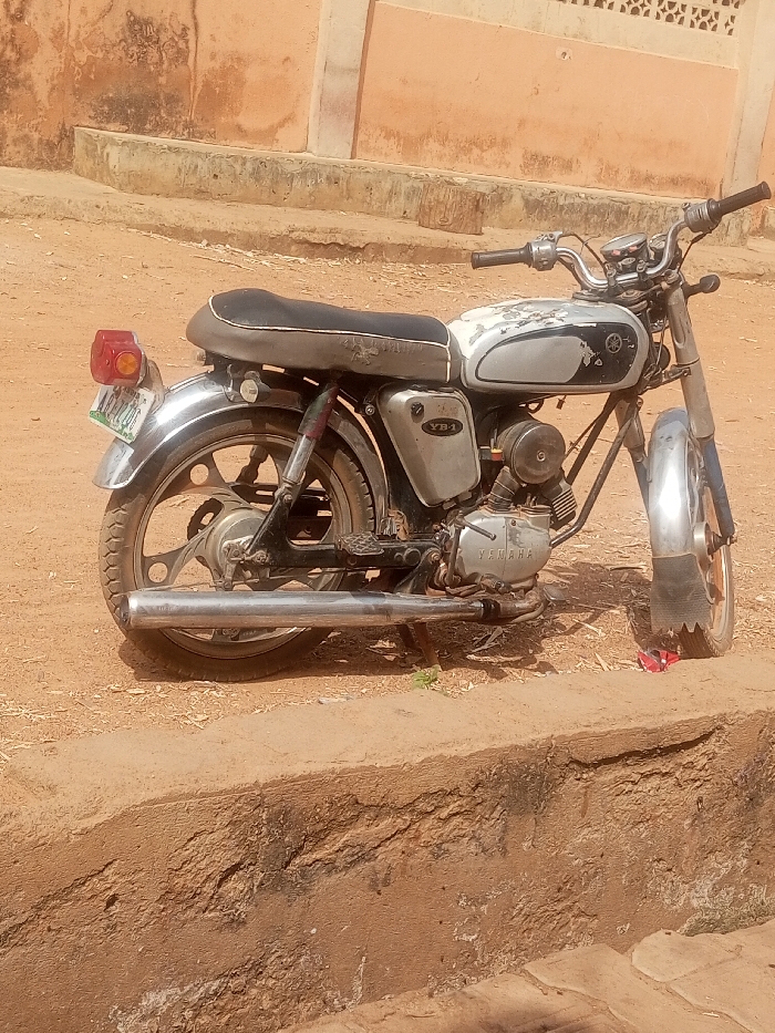 The image displays a stationary, older model Yamaha YB-1 motorcycle situated outdoors on a reddish-brown dirt surface in Rigasa, Nigeria