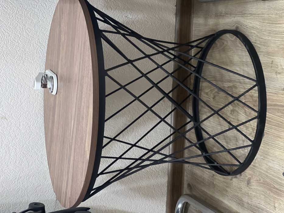 The scene depicts an interior setting in Namangan City, Uzbekistan, featuring a static arrangement of furniture and an object. A round side table with a dark brown wood-grain top and a black metal base is centered in the frame. The table's base consists of an intricate, open-weave structure formed by intersecting black metal rods, flaring outwards from the top before converging to a circular bottom ring. Positioned near the center of the table's surface is a small, white stapler. The floor beneath the table is a light brown wood-look laminate or parquet. The background reveals a light-colored, textured wall, likely stucco or patterned wallpaper, with a darker brown baseboard running along the bottom. A silver-colored, curved metal object, possibly a furniture leg, is partially visible on the floor to the left of the table. A dark, undefined object is partially visible on the far left edge, adjacent to the wall. No individuals are present, and no actions or interactions are depicted.