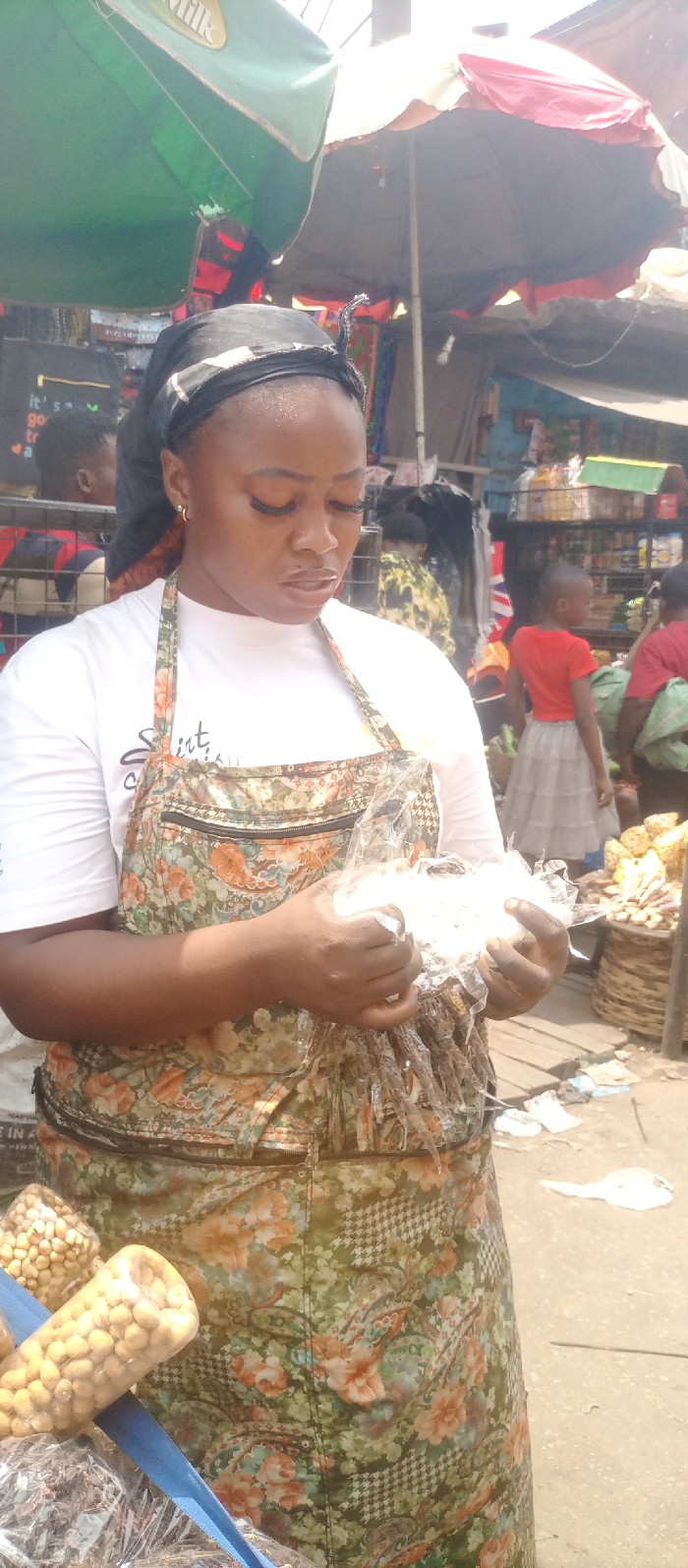 The image depicts an outdoor market scene in Nkpor, Nigeria, under bright daylight. The central figure is a young adult female with dark skin, wearing a black headscarf, a white short-sleeved t-shirt, and a floral-patterned apron featuring green, orange, and brown hues with multiple zippered pockets. She has gold stud earrings and appears to have sweat visible on her forehead. Her gaze is directed downwards as she holds a clear plastic bag containing a white, fibrous product in both hands. Below her hands, several dark, elongated, dried items, possibly dried fish or roots, are bundled. To her immediate left foreground, two clear plastic bottles filled with light-colored, round legumes, likely groundnuts or peanuts, are partially visible. In the background, other individuals are present, including a child in a red t-shirt and a light grey skirt positioned to the right of the central figure, and another child in a red t-shirt further to the right. Market infrastructure is visible, including a green and white sun umbrella partially obscuring the top left, which displays "Milk" text. Another red and white umbrella is visible in the upper right. Stalls with various goods, including baskets filled with items and shelves, line the background. The ground consists of an unpaved surface, possibly dirt, with scattered debris. The overall environment indicates a busy commercial area.