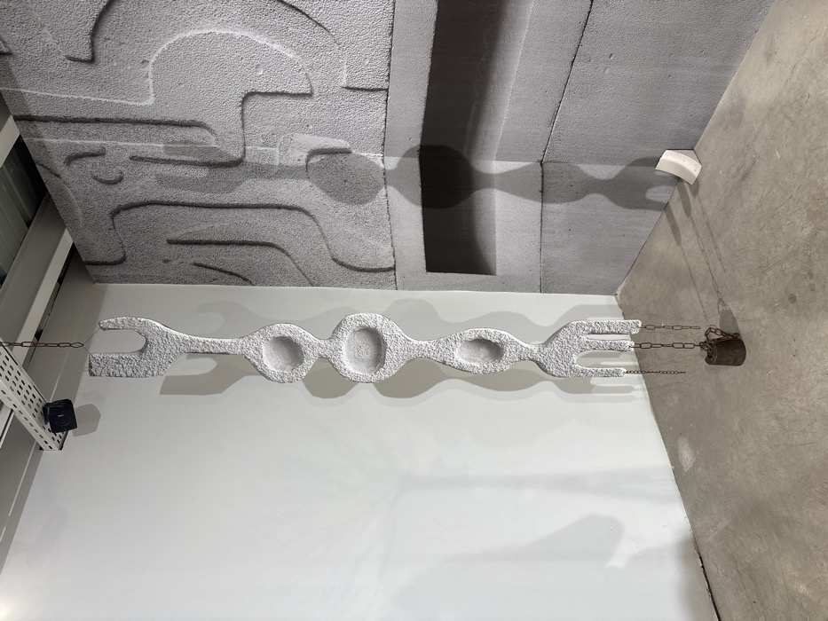 The image displays an interior space, likely an art gallery or exhibition area. A large, vertically oriented sculpture, textured white in color, hangs from the ceiling by a thin metal chain. The sculpture features a stylized, elongated form with a bifurcated top, three equidistant oval indentations along its body, and a three-pronged fork-like base. Two rusted metal chains descend from the bottom prongs; one is attached to a dark, rusted, cylindrical weight resting on the light gray concrete floor, while the other hangs freely. The left wall is smooth and painted white. The right wall and the adjacent corner wall are textured light gray, exhibiting deeply embossed, curvilinear, maze-like patterns. An overhead metal channel, typically used for utilities, is visible near the ceiling, with a small black rectangular speaker attached to it. Distinct shadows of the suspended sculpture are cast onto the textured walls and floor, creating distorted, elongated forms. A small, off-white, wedge-shaped object is positioned on the floor in the far right corner. The specific location within the city of Tel Aviv, Israel, is not discernible from the visual information provided.