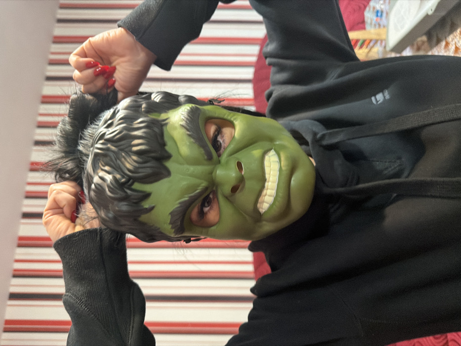 - "A person is seen indoors in Kralev Dol, Bulgaria, from a chest-up perspective, wearing a green plastic full-head mask depicting the Marvel character Hulk, complete with a grimacing expression and molded black hair" by FM-2MQ1v2, licensed under CC BY 4.0