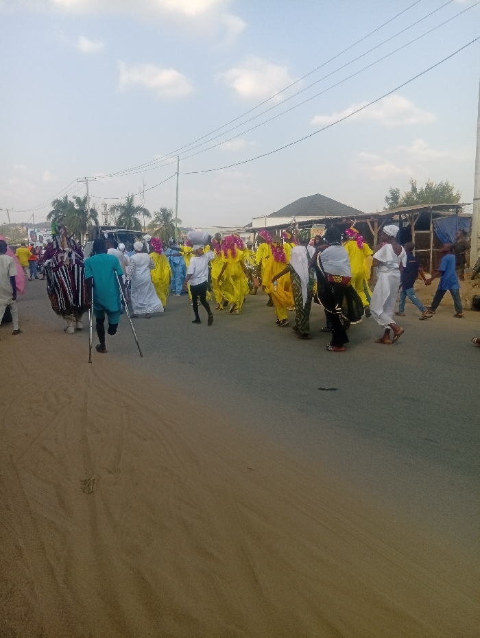 The image depicts an outdoor street scene at Itakpe Junction, Nigeria, under a light blue sky with scattered white clouds. A procession of approximately 20-30 individuals occupies the central and right portions of the frame, moving from left to right. The ground transitions from an unpaved, sandy surface in the foreground to a paved road further into the midground. The largest group of participants, positioned centrally, consists of approximately ten individuals dressed in vibrant yellow, long-sleeved garments, many featuring elaborate pink or red feather-like head adornments. One individual within this group carries a white, rounded object on their head. To the left of this yellow-clad group, a person wearing a teal-colored top and dark trousers walks with a prosthetic left leg and uses two crutches. Further left, a person in a dark and white striped, possibly ceremonial, costume is partially visible. Several other individuals are dressed in white robes or garments, some with head coverings. On the far right, two children in casual attire are walking. In the background, utility poles with multiple overhead power lines are visible against the sky. Various buildings line the street, including structures with dark, angular roofs and what appear to be rudimentary market stalls or shelters on the right. Palm trees are present on the left side of the road, and a distant building with a prominent minaret-like feature is visible on the far left. A billboard with green text is partially visible on the left side of the street. The scene is illuminated by natural daylight.