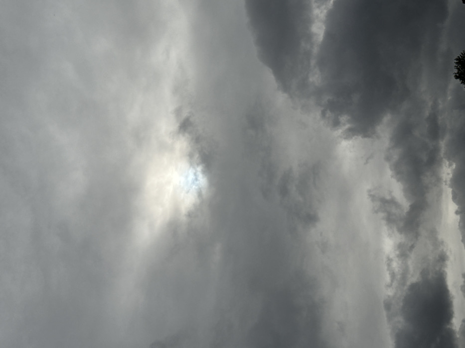 The image displays an overcast sky above Courbevoie, France. The frame is dominated by multiple layers of clouds, ranging in color from light gray and diffuse to dark gray and dense. A singular, bright, diffuse light source, presumed to be the sun, is partially visible in the upper-middle section, partially obscured by clouds and exhibiting a subtle bluish tint at its brightest point. No people, discernible man-made structures, or significant ground features are visible, with the exception of a small, dark area of foliage at the bottom right edge, consistent with a treetop.