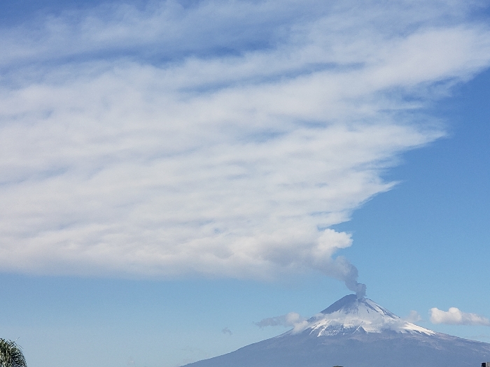 The image displays a panoramic view of an actively erupting, snow-capped stratovolcano under a bright blue sky with extensive cloud formations. The scene is observed from the vicinity of San Bernardino Tlaxcalancingo, Mexico. A large, conical volcano, its upper slopes covered in white snow or ice, dominates the lower central and right portions of the frame. A distinct, gray-to-white plume of ash and smoke emanates vertically from the volcano's summit crater, rising into the atmosphere before dispersing horizontally towards the upper right. The base of the volcano is obscured by indistinct, darker terrain features. The sky occupies the majority of the frame, featuring scattered white clouds. A prominent, elongated formation of white clouds stretches horizontally across the upper half of the sky, partially obscuring the upper left. In the lower left foreground, a small portion of a green palm frond is visible. No human figures or discernible man-made structures are present in the main composition.