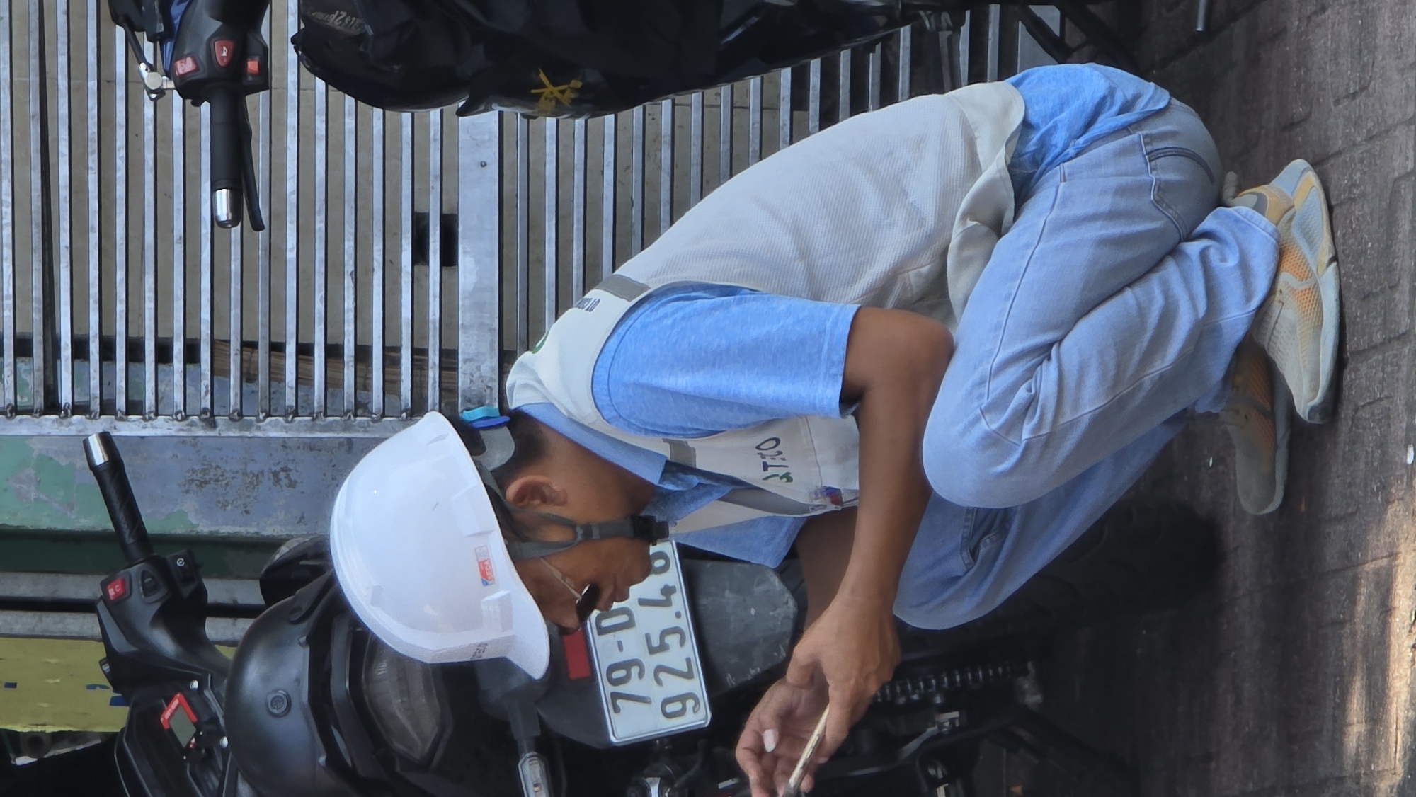 A man in a white hard hat, light blue t-shirt, and a light-colored vest is crouching next to a parked black motorcycle in a city in Vietnam. He is focused on something near the motorcycle's license plate, which reads "79-D1 925.46". The man is wearing glasses and has a tool in his hand. The setting appears to be outdoors, with metal bars visible in the background. The man is also wearing light blue jeans and sneakers.