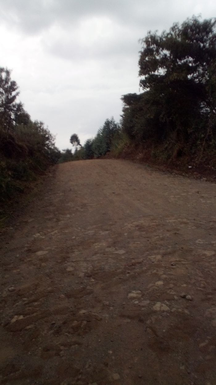A dirt road in Ndeiya, Kenya, is depicted under an overcast sky