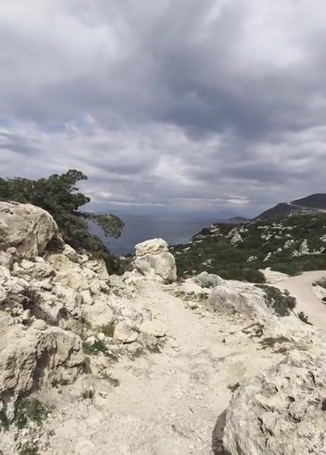 rocky, somewhat barren landscape. The foreground is dominated by light-colored rocks and a path, leading towards a view of the sea. In the distance, there's a body of water under a cloudy sky. A few green trees are scattered throughout the scene, particularly to the left. On the right, a road winds through a green, hilly area. The overall impression is of a natural, coastal environment under a potentially overcast sky.