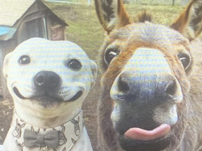 A close-up outdoor image from Simeonovgrad, Bulgaria, depicts two animals facing the camera. On the left is a short-haired, light-colored dog with dark eyes and a black nose; its facial expression suggests an upward curve of the mouth. The dog wears a patterned collar adorned with cartoon donkeys and a gray bow tie. On the right, a brown donkey is positioned, exhibiting prominent ears, dark eyes, and a pink tongue extended and curled upwards from its mouth. In the background behind the dog, a weathered wooden structure with a peaked roof and a light-colored corrugated metal roof is visible. The background behind the donkey consists of blurred green vegetation.
