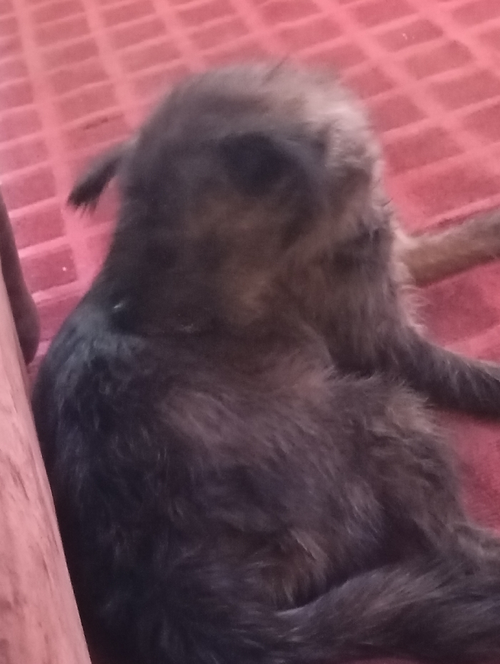 A gray and brown furry dog rests on a textured red surface. The dog's body is positioned diagonally, with its back towards the viewer. Its head is slightly blurred, obscuring facial details. One ear is visible, perked up slightly. The dog's fur appears shaggy. A reddish-brown object is visible on the left side of the frame, possibly a piece of furniture.