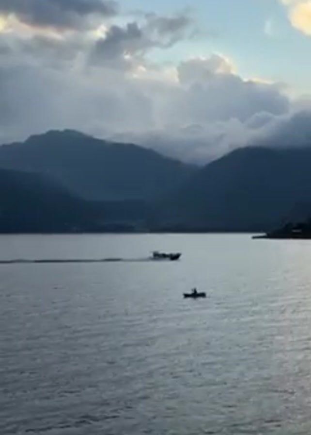 body of water with mountains in the background. The sky is partly cloudy, and the light suggests it might be dawn or dusk. There are two boats visible on the water. One appears to be a larger boat moving at a moderate speed, leaving a trail behind it. The other is a small kayak or similar vessel with a single person on board, moving slower than the larger boat. The overall scene conveys a sense of tranquility.