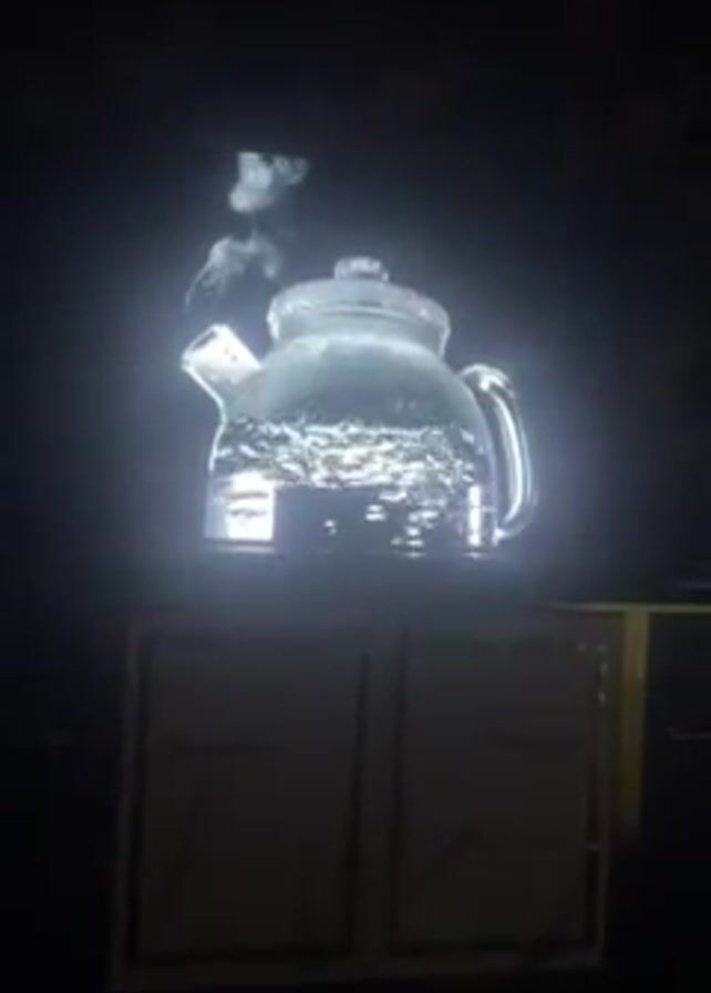A glass teapot boils on top of a white cabinet. The teapot is lit from below with a bright light, causing the water inside to glisten. Steam rises from the teapot's spout. The background is dark.