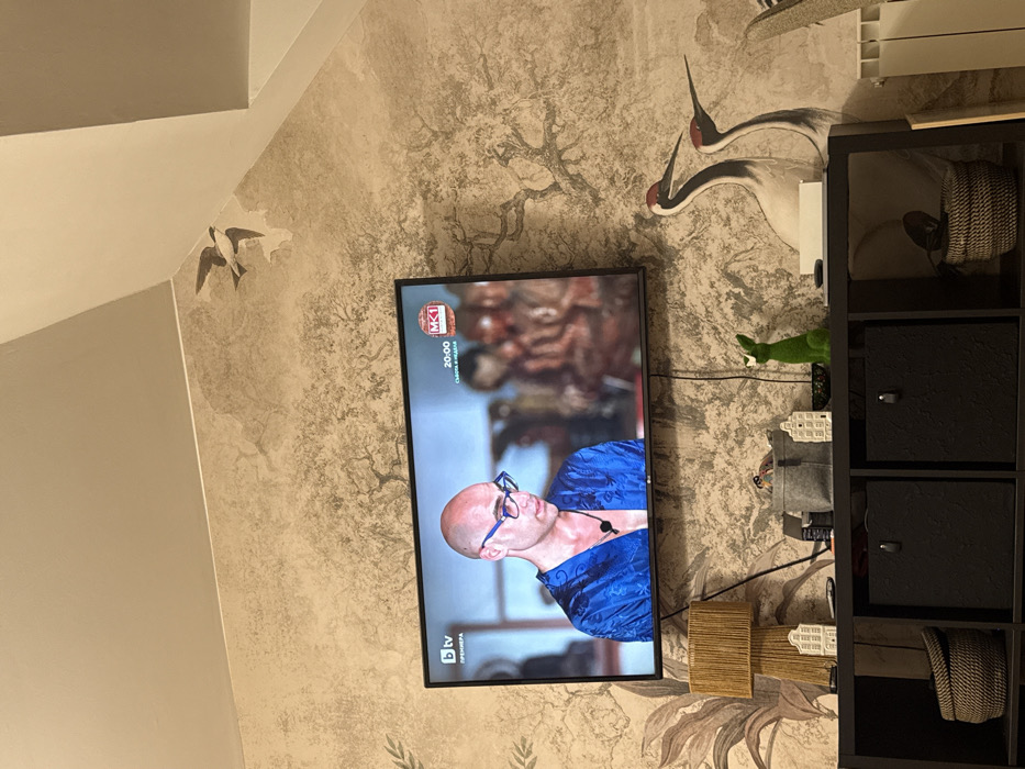 This image captures an interior living space in Sofia, Bulgaria, featuring a wall covered in muted-toned wallpaper patterned with stylized trees and foliage. A black LG flat-screen television is mounted centrally on the wall, displaying a bald male figure wearing blue-rimmed glasses and a blue patterned robe with an attached lavalier microphone. The television screen prominently shows the "bTV ПРЕМИЕРА" logo on the top left and the "МК1 20:00 СЪБОТА И НЕДЕЛЯ" logo on the top right, confirming Bulgarian broadcast content. Below the television, a dark, modular cube-shelf unit is positioned, containing multiple cubbies, some filled with dark fabric storage bins. Adorning the top surface of this unit, from left to right, are a dark woven basket, a textured brown table lamp, two white miniature house-shaped figurines, a grey fabric container, a small dark bowl, a bright green fuzzy rabbit figurine wearing white glasses, and a white rectangular object. To the right of the television, on the wallpaper, a large graphic illustration of two white cranes with red-crowned heads is visible. In the upper right corner of the wall, near the angled ceiling, two swallow-like bird decals are affixed. A white radiator is partially visible on the far right, below the crane illustration. A black power cable descends from the television towards the shelf unit.