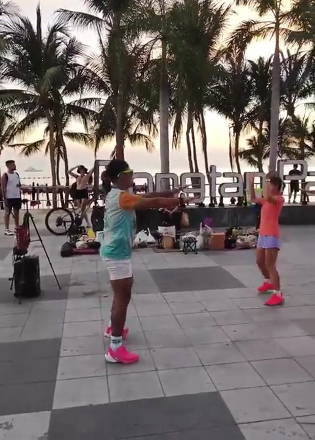 A group of people is exercising together in a public square near a beach at dusk