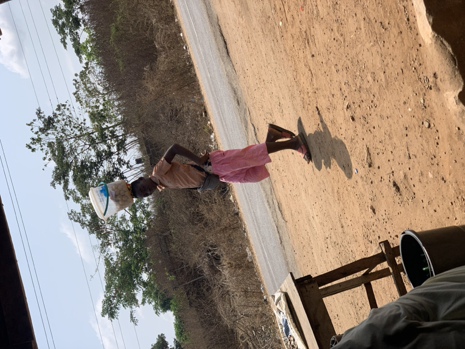 The scene is located in Kabba, Nigeria. A young individual with dark skin, wearing an orange short-sleeved collared shirt, pink knee-length shorts, and dark sandals, stands or walks on a reddish-brown dirt path. A grey fanny pack is worn across their waist. The individual balances a transparent plastic bucket, containing numerous light-colored spherical items, on their head. Their left hand rests on their hip. Behind the individual, an asphalt road is visible, running parallel to the foreground. The area adjacent to the road features dry, sparse brown shrubs and taller green trees, extending into the background under a clear blue sky with sparse clouds. Strong, defined shadows on the ground indicate bright daylight. In the immediate left foreground, a partial view of a wooden table with a light-colored covering is visible, next to a dark bucket on the ground. A blurred arm and shoulder of an unseen person occupy the extreme lower-left corner of the frame.