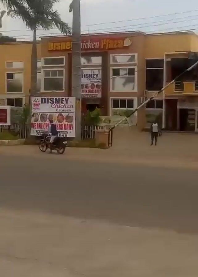 daytime street scene in front of a building labeled "Disney Chicken Plaza