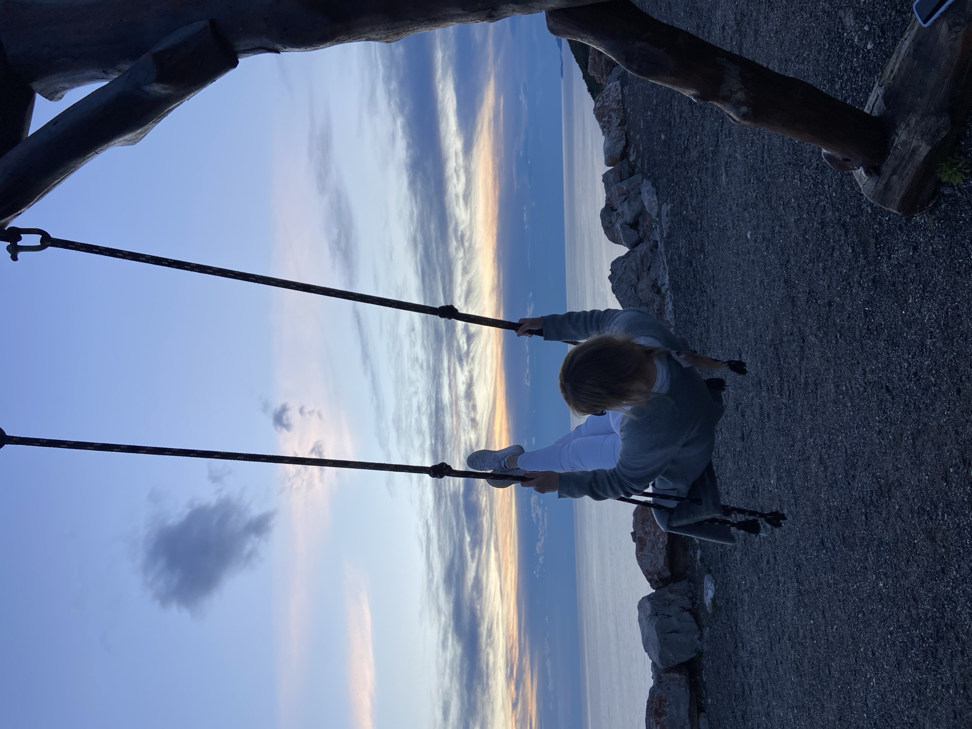 A person sits on a rope swing positioned between two wooden supports. The backdrop is a body of water and the sky is blue with white and orange clouds. The ground is covered in small dark stones and larger rocks. The person is wearing white pants and white shoes, and a gray hooded sweatshirt. They are holding onto the ropes of the swing. The photograph may be taken at a swing set near Kovačko Polje, Montenegro.
