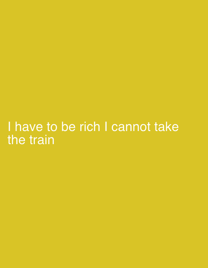 The image is a digital graphic featuring white, sans-serif text left-aligned and positioned in the lower portion on a solid mustard yellow background. The text reads: "I have to be rich I cannot take the train". No discernible people, subjects, objects, actions, interactions, or environmental details are depicted within the graphic. The provided contextual location is Secaucus, United States.
