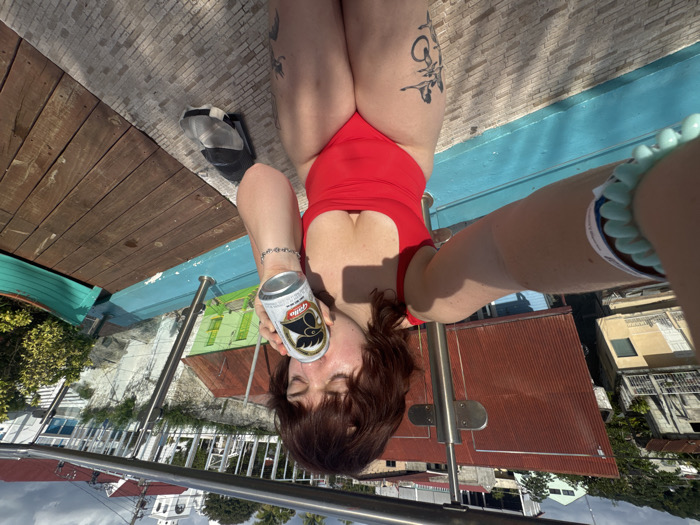 A woman in a red swimsuit poses upside down, holding a beer can to her forehead. She stands on a structure with a blue railing, with buildings visible in the background. The woman has dark hair and tattoos on her legs. Her hand is visible in the foreground wearing a bracelet. To the left, there's a wooden surface with a sneaker. The camera angle is unusual, emphasizing the upside-down perspective.