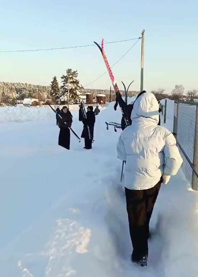 Several people are walking in a snowy field. The camera follows a person in a light blue puffer jacket and black pants. This person has a pair of skis with pink tips over their shoulder. The other people in the group, at least three of whom are wearing long, dark robes, are carrying skis as well. There is a metal fence running along the edge of the field and a few houses and trees are visible in the background under a clear, blue sky. The person in the blue jacket stops and lifts their skis up to show the camera while saying something to someone in the group.