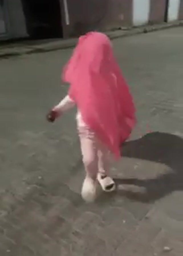 A young child stands on a paved surface, fully covered by a pink, sheer fabric. The child wears a white, long-sleeved shirt and pink leggings. They point at their head, which is obscured by the fabric. The background shows a building with multiple doors and a brick wall. The lighting suggests it is dusk or evening.