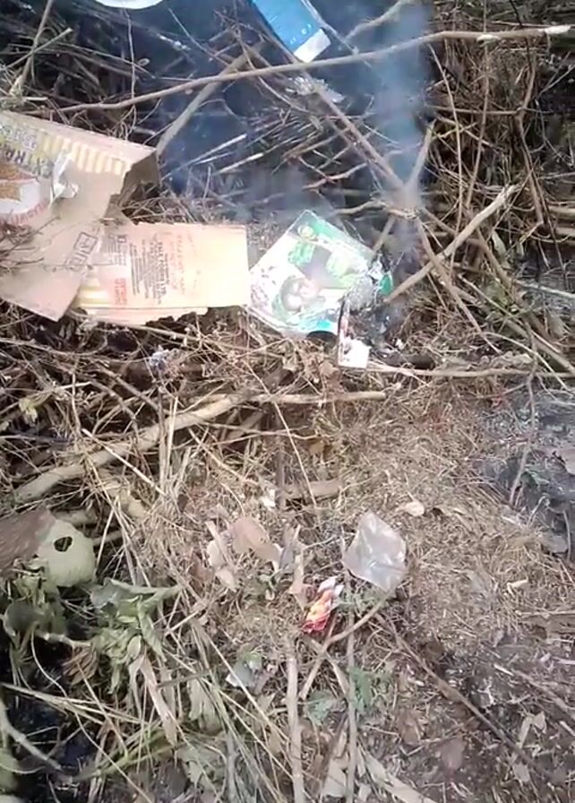 ground-level view of burning trash and debris in an outdoor environment. The trash includes cardboard boxes, paper, a white cloth item, and a small blue box. Smoke is visible rising from the burning material. The area is also littered with twigs, branches, and other organic debris. Some green vegetation is also visible. The ground is dirt.
