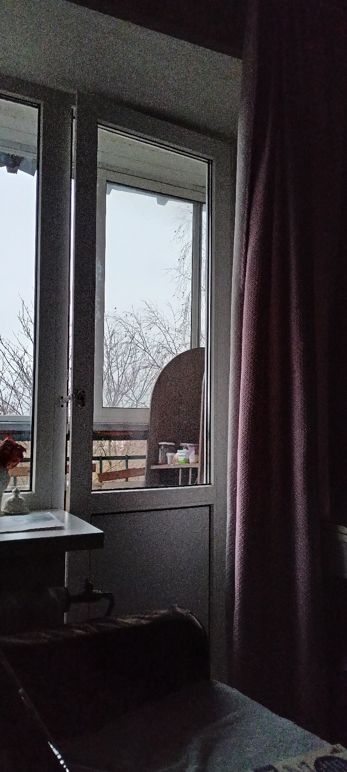 The image presents an interior view looking outward through a white-framed balcony door and an adjacent window pane, situated in the city of Sergiyev Posad, Russia. The scene is lit by diffused, overcast natural light from the exterior. In the immediate foreground, to the lower right, an indistinct, dark shape resembling a head and upper torso, possibly covered, is partially visible. Adjacent to this, a vertically hanging, dark reddish-purple curtain with a textured weave occupies the right side of the frame. On the left side of the interior, a light-colored table or surface holds a white vase with red floral elements, a smaller white decorative object, and a flat white rectangular item. The central part of the image is dominated by the white-framed balcony door and the adjacent window. The left vertical frame of the balcony door features visible hinges and a latch mechanism. Through the glass, a balcony is discernible. A wooden railing, appearing weathered or rustic, extends horizontally across the mid-ground of the balcony. On the balcony, to the right of the doorway, a curved, speckled reddish-brown panel is upright. To its left, on a small surface, multiple containers are arranged, including a clear glass jar and a white container with a green label displaying Cyrillic text, possibly "ЛЕБЕДИН". Beyond the balcony and its railing, a sparse exterior environment is visible. Numerous bare, leafless deciduous tree branches are silhouetted against a uniformly light gray, overcast sky. No distinct human figures are actively present or identifiable within the observable portions of the scene.