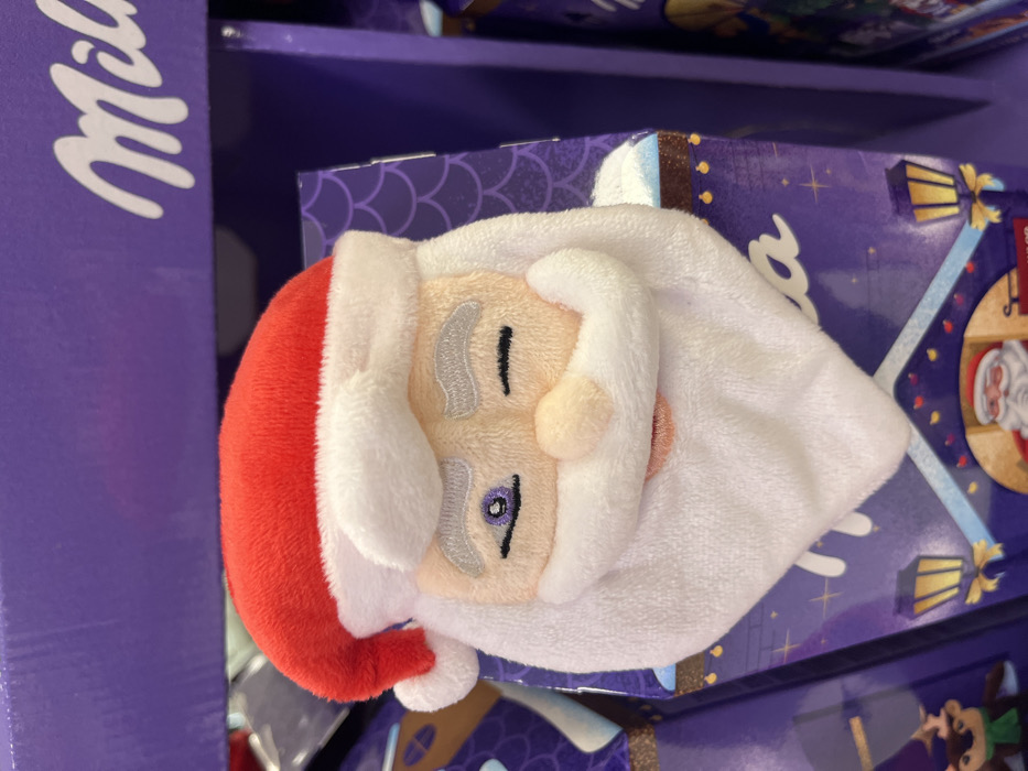 A plush toy Santa head with a red hat and white beard rests on a purple Milka chocolate advent calendar