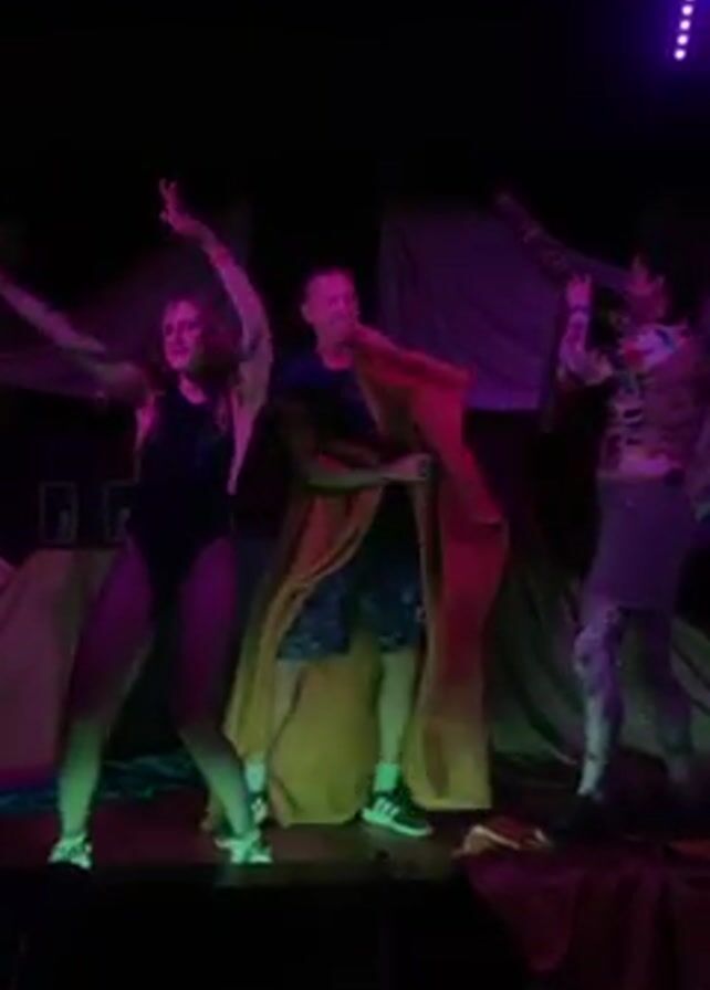 performance on a stage with three figures. A woman in a black bodysuit and light sneakers is on the left, dancing with her arms raised. A man in a patterned t-shirt, shorts, and green sneakers is in the center. He is holding a large piece of colorful fabric. On the right stands a figure in a patchwork jacket, skirt, and stockings, with short dark hair. The background is decorated with draped fabrics of various colors, illuminated by colored stage lights, primarily green and purple. There are also some framed pictures on a small table in the background. The performers are dancing and interacting with the fabric on stage.