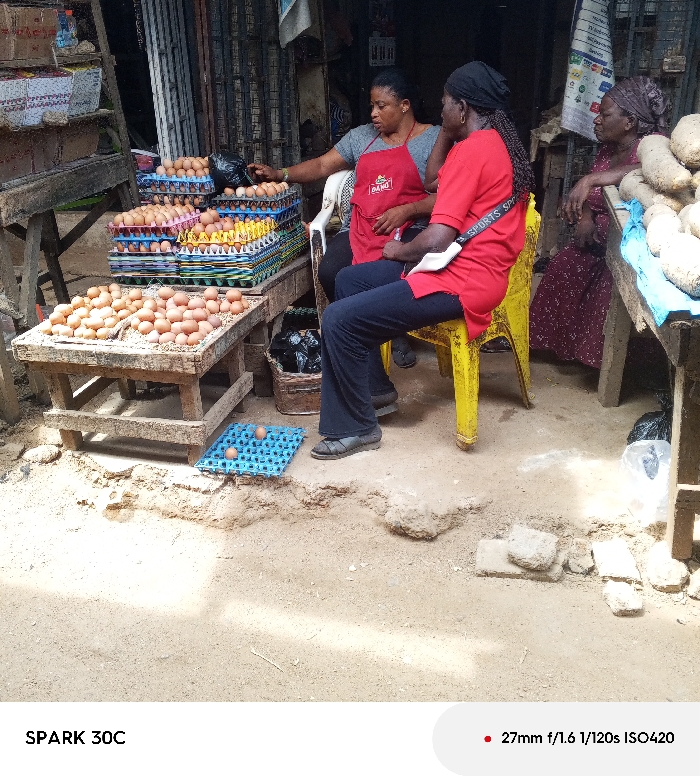 The image depicts an outdoor market stall scene in Sabon Tasha, Nigeria