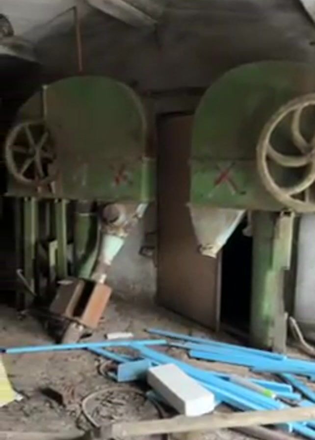 The camera slowly pans across a cluttered, dimly lit room. There are two large, old, green machines dominating the foreground. They have large wheels and appear to be industrial equipment, perhaps from a mill or factory. A closed wooden door sits between them. The floor is littered with debris, including blue plastic pipes, wires, insulation, and other miscellaneous objects. The walls are concrete and appear worn. There is a simple light fixture hanging from the ceiling. The overall atmosphere is one of disuse and abandonment.
