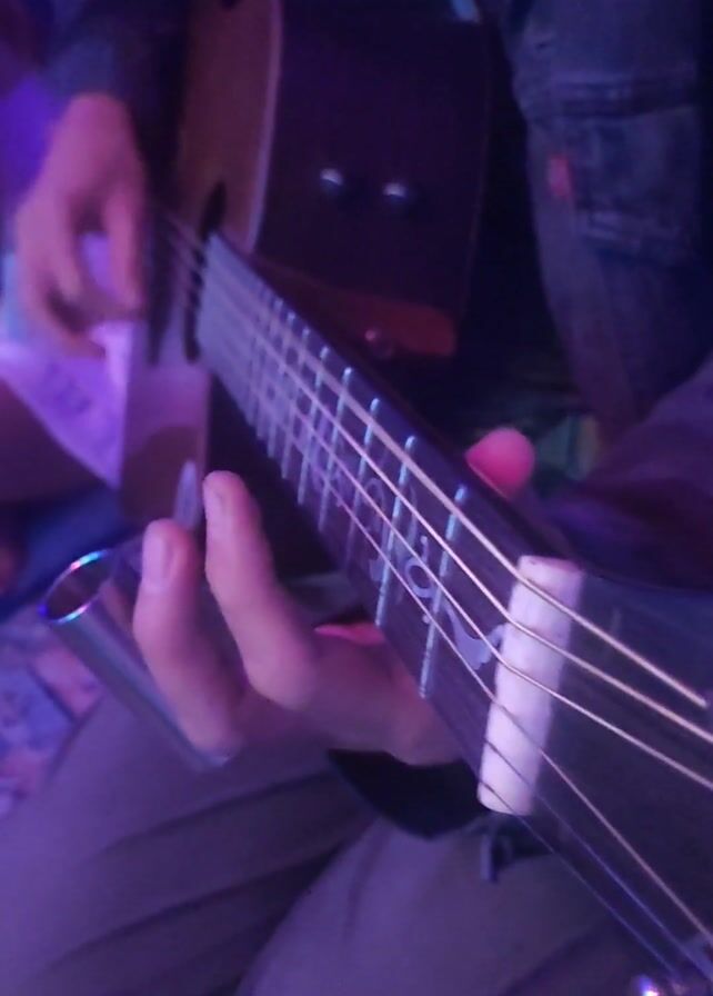 A person is sitting down and playing an acoustic guitar. They are wearing a denim jacket and khaki pants. A silver slide is on the pinky finger of their left hand. The guitar is close up in the center of the frame. A purple light illuminates the scene.