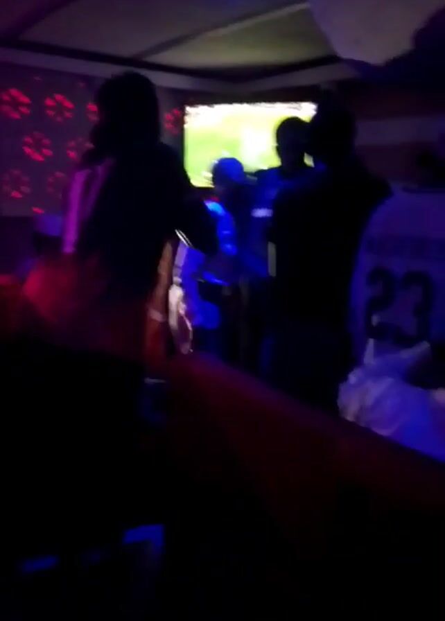 dimly lit room with several people. The space is illuminated by blue, red, and purple lighting. A television screen is visible in the background. People are moving and appear to be dancing. The overall setting seems to be a club or a party. The video is shaky and the focus is unclear at times.
