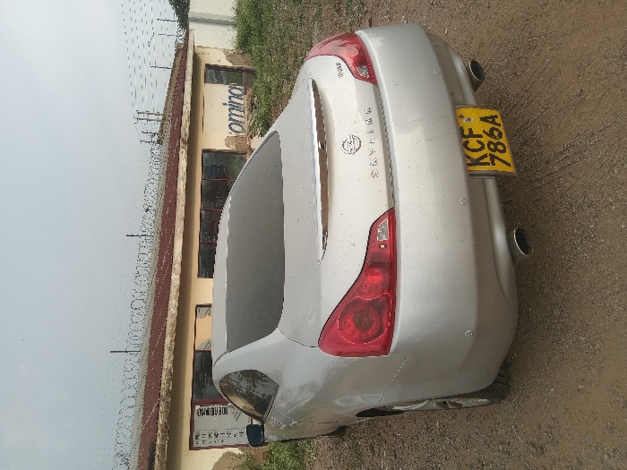The scene depicts a silver two-door Nissan Skyline coupe, identifiable by its trunk badging, parked on a dirt lot in Kisumu, Kenya