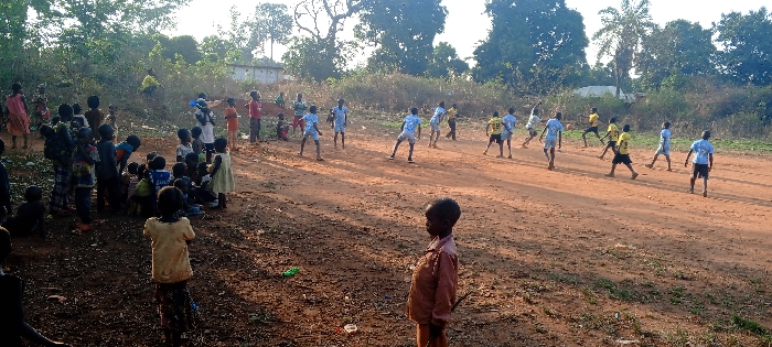 This image captures an outdoor scene in Konongo, Democratic Republic of the Congo, centered on a large group of people on a reddish-brown dirt field. In the mid-ground, approximately 16-18 young males, wearing either light blue and white jerseys or yellow and black jerseys, are actively engaged in what appears to be a football game, spread across the unpaved expanse. To the left, a cluster of approximately 25-30 younger children and several adults are gathered, primarily observing the activity on the field. A solitary child in a light brown shirt stands in the immediate foreground, facing right, also observing the scene. The background features dense green foliage, bushes, and numerous trees, with a small light-colored building partially visible amidst the vegetation on the left side. The scene is illuminated by bright daylight, casting visible shadows. Scattered debris is present on the dirt ground.