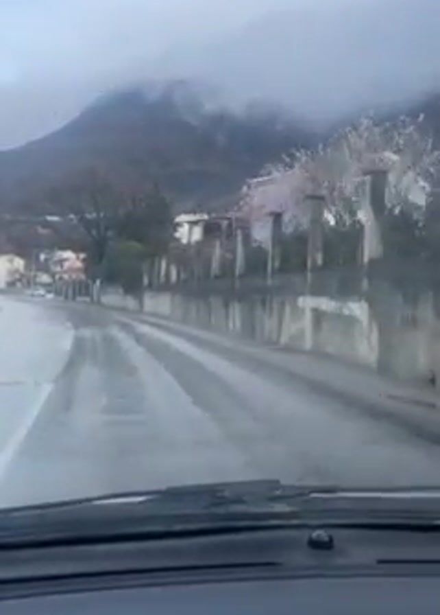 A car is driving down a wet road in a town near a mountain on an overcast, rainy day. The wipers are on to clear the rain from the windshield. Buildings and a long wall line the right side of the road. The mountain is partially obscured by clouds. A road marking shows the direction to turn right.
